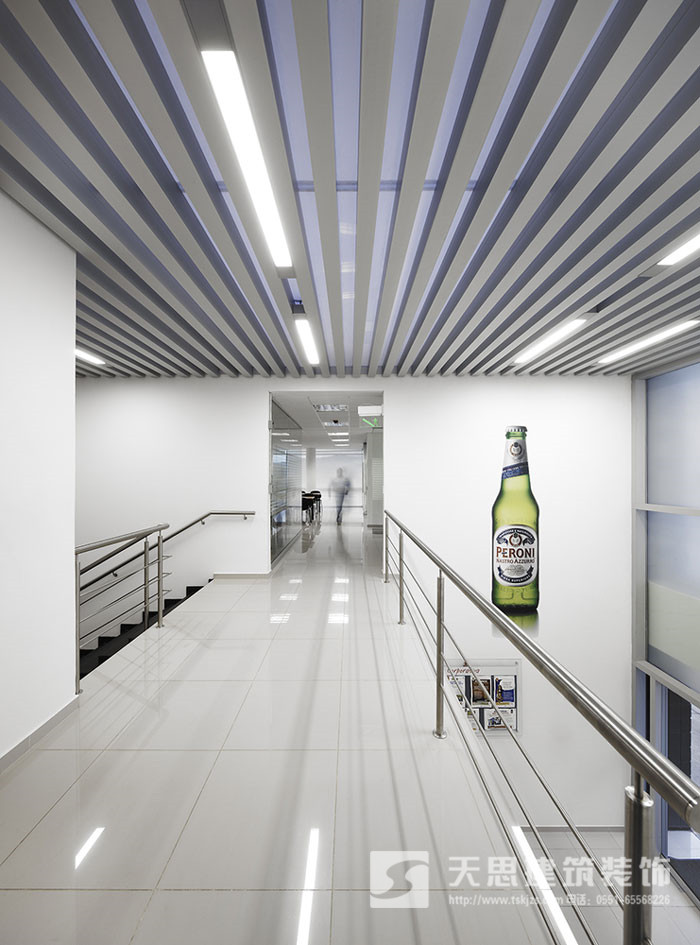 过道好似云梯,洁白的空间给人一种别样的感觉,让空间不在单调,大大的啤酒瓶镶嵌在空间的白墙上,既做为点缀,同时也作为企业的品牌宣传。