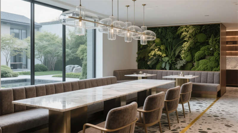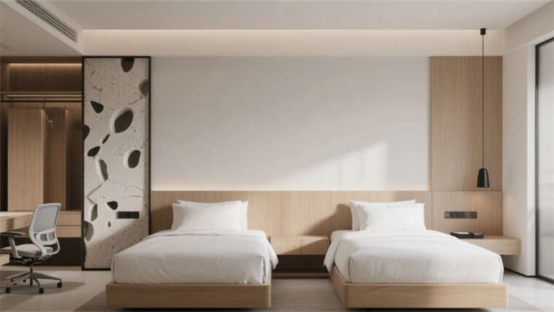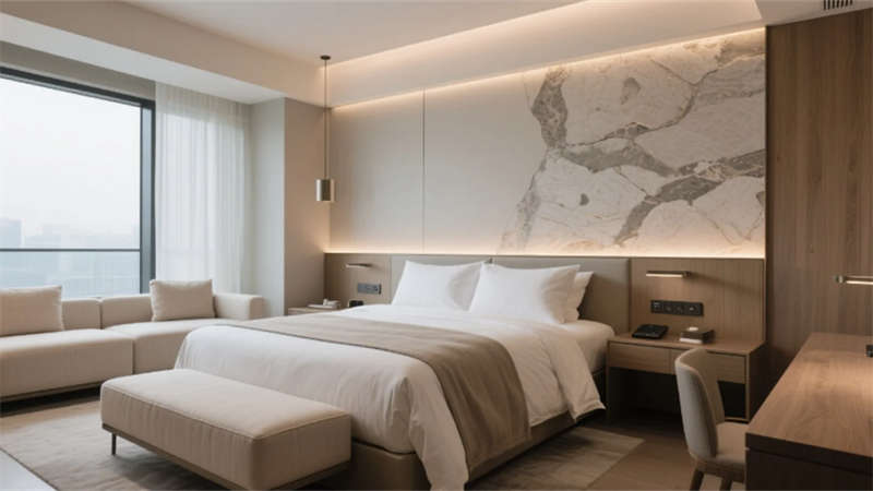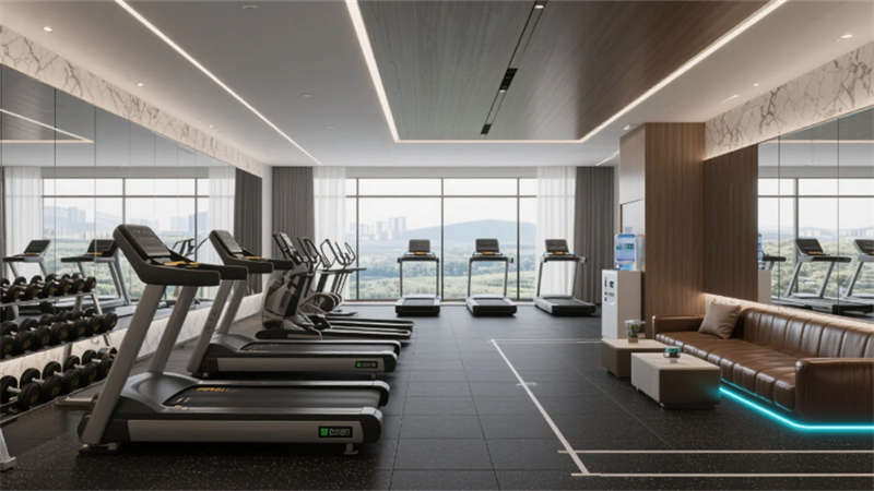客房以中性色调为基底,亚麻、柚木与肌理墙面营造松弛感,智能化系统隐于无形,从电动纱帘到无线充电桌,细节中渗透科技温度。双床房的可移动屏风与定制家具,兼顾私密与灵活;卫浴空间以雾面玻璃与水磨石打造朦胧质感,哑光五金件点缀现代精致。餐厅以共享长桌与绿植墙激活社交氛围,水磨石地面镶嵌的黄铜线条如溪流蜿蜒,呼应徽派建筑中的流水意象。健身房镜面与橡胶地面反射城市灯火,休憩区的皮质软榻与渐变灯光,为运动后提供片刻宁静。