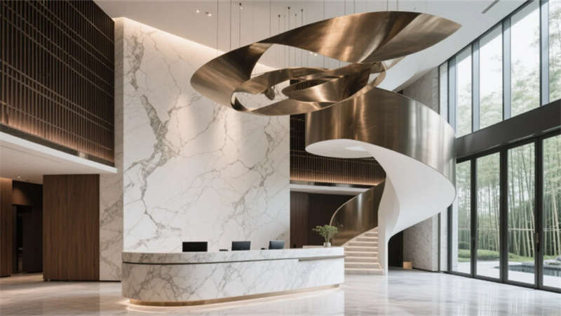 这座酒店以自然与人文的共生为灵感,将徽州山水意境凝练于现代设计语言中。建筑外观以几何切割的洞石立面与通透玻璃幕墙交织,垂直绿植如水墨笔触般攀附墙体,入口处镜面水景倒映天光云影,模糊建筑与自然的边界。步入大堂,挑高空间内悬浮的螺旋楼梯与抽象金属装置形成动态视觉焦点,暖木格栅与冷冽大理石碰撞出静谧与奢华的平衡,全景窗将庭院竹林景观引入室内,光影随时间流转而变幻。