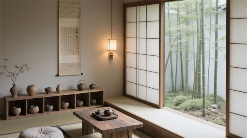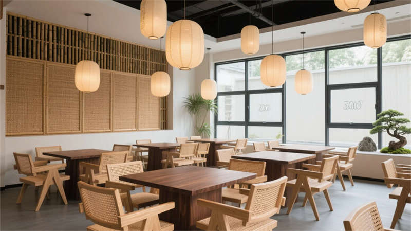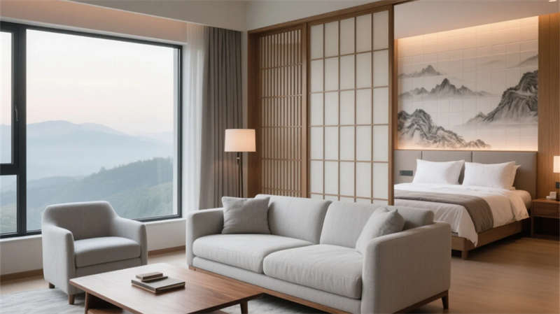 大堂以格栅天花与山水背景墙定调,光影交错间传递宁静力量。餐厅借竹编与纸灯演绎传统匠心,窗外庭院景观延伸视觉层次??头哭鹌备醋笆?,棉麻材质与低饱和度色彩引导深度放松,套房通过屏风巧妙划分动静区域。茶室以博古架和宣纸屏风构筑禅修意境,而庭院花园的枯山水与竹影,则成为自然与建筑的共生隐喻。