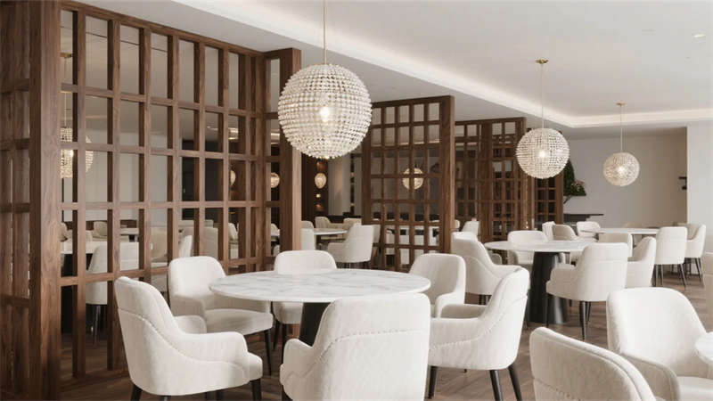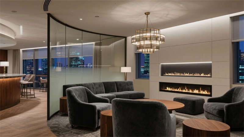 公共空间注重功能与美学的平衡。行政酒廊通过弧形玻璃划分动静区域,嵌入式壁炉跳动的火焰软化商务空间的冷峻感;多功能会议室采用可变形家具系统,胡桃木饰面墙与线性灯光共同构建专注场域;全日餐厅以开放式厨房为舞台,球形吊灯在岩板餐桌上投下温暖光晕,激发商务社交的愉悦可能。