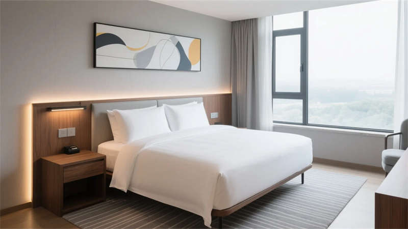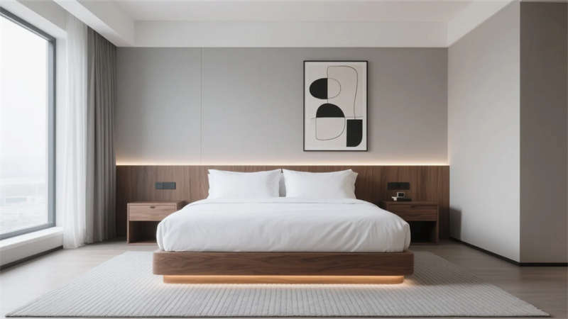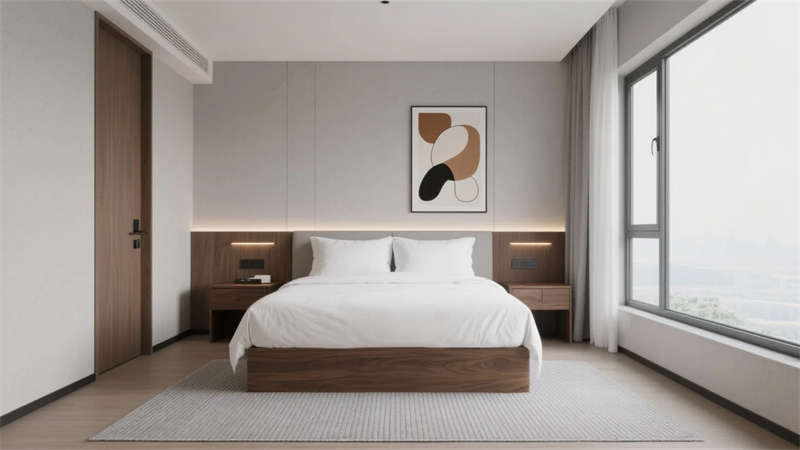 步入挑高大厅,弧形前台与悬浮灯饰构成视觉焦点。天然石材地面倒映着落地窗引入的天光,米白色沙发组错落分布于绿植景观间,模糊室内外边界的同时,为商务会晤创造轻松场域??头垦有酥粕杓朴镅?,悬浮式家具减轻空间负重,隐藏灯带在灰蓝色床品上投下柔光,全景窗将城市天际线转化为动态壁画。