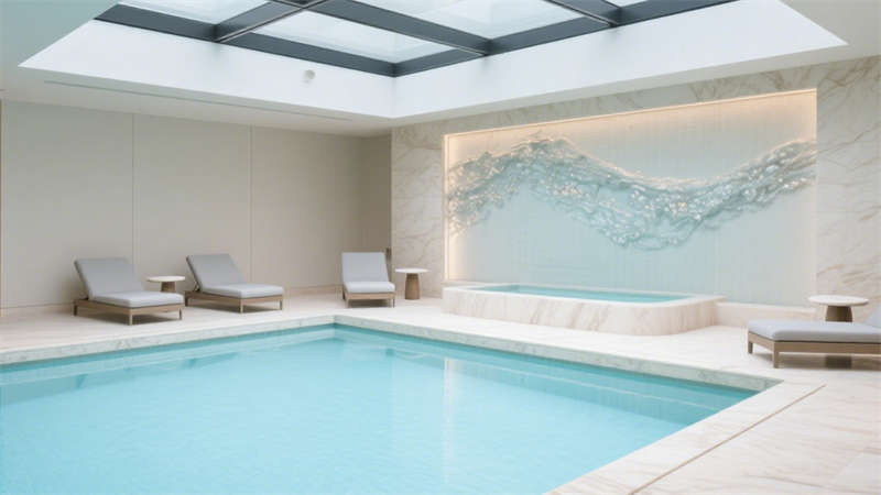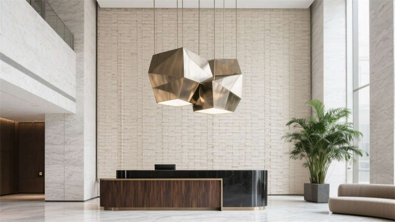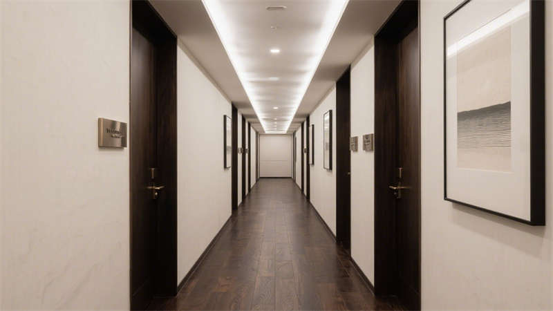 在公共区域,大堂以开阔通透的布局呈现,大面积的落地玻璃引入充足自然光线,让空间更显明亮通透。接待区选用柔软的布艺沙发与金属质感的装饰摆件相搭配,既传递出温馨的氛围,又不失精致格调。走廊设计则注重引导性,墙面采用肌理感材质,搭配嵌入式灯光,营造出静谧而优雅的行走体验。
