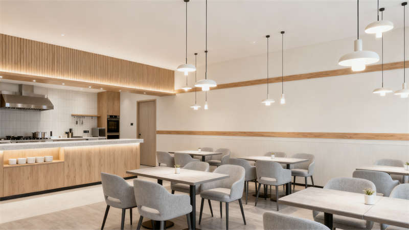 餐厅区域设计简洁而富有质感,灯光设计巧妙,既保证了充足的照明,又营造出温馨的用餐氛围,桌椅摆放合理,留出足够的活动空间,让住客能在舒适的环境中享受美食。?