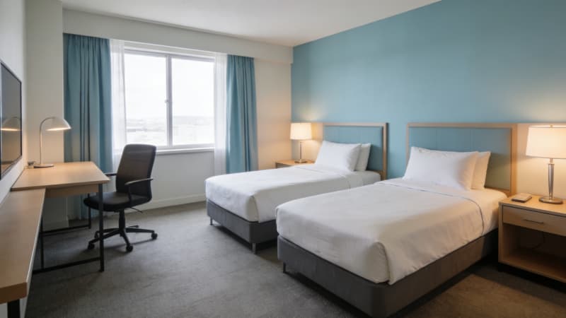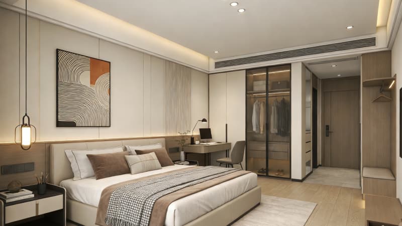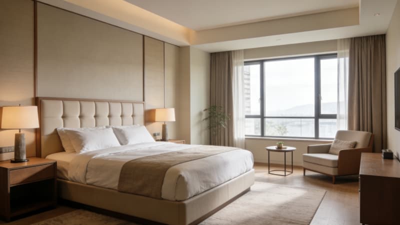 本方案专为合肥本地酒店量身打造,深度融合皖韵文化与现代设计美学,覆盖外观、大堂、走廊、双床房、两间特色大床房、卫生间及会议室八大核心空间。外观以简约大气的线条为基础,嵌入徽派建筑标志性的马头墙元素与落地玻璃,实现采光与地域辨识度的双重提升。大堂采用挑高设计,搭配浅灰石材地面与原木装饰,前台背景墙融入巢湖风光元素,营造开阔舒适的接待氛围??头糠智魅罚蟠卜?侧重温馨静谧,搭配暖光照明与定制软装;大床房2主打商务简约,增设多功能办公区;双床房注重空间利用率,保障宾客隐私。卫生间采用干湿分离设计,搭配防雾镜与智能卫浴设备,提升便捷性?;嵋槭遗浔父咔逋队坝胱ㄒ瞪低?,可满足商务洽谈、小型发布会等多元需求。整体设计兼顾美观性与实用性,既契合合肥文旅发展趋势,又能精准匹配商务、旅游等不同客群需求,助力酒店提升核心竞争力。