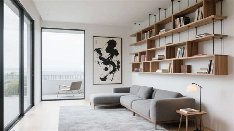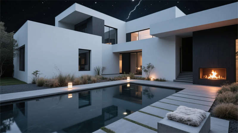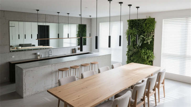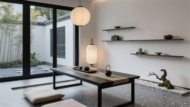 庭院成为生态枢纽,几何水景倒映建筑体块,耐旱植物与灰石板构成低维护景观。多功能厅通过灵活隔断适应共享需求,艺术品陈列架随动线旋转生趣。整体摒弃繁复装饰,用材质本真触感、光影时间轨迹与城市山水意境,营造大隐于市的当代栖居范本。