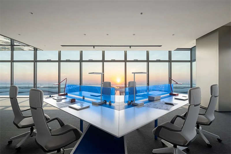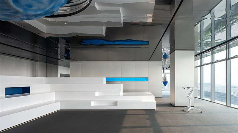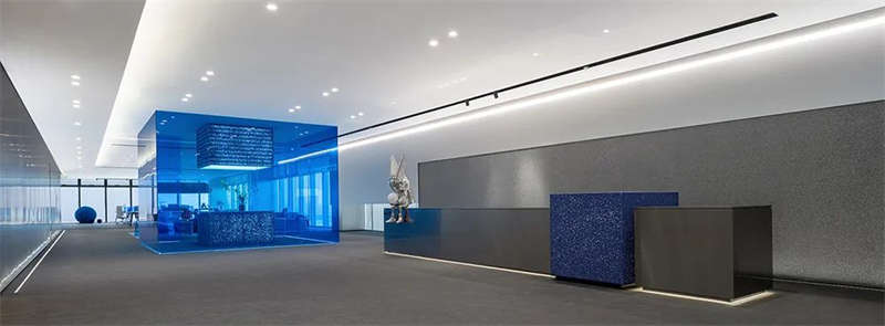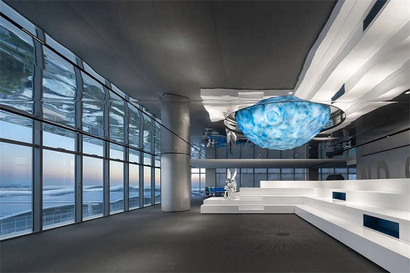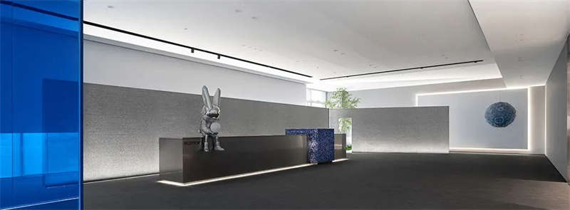 室内空间由功能家具和装置形成自然分隔,空间整体因祛除隔断而产生了流动,这与科学巨匠斯蒂芬·霍金的宇宙观具有一种相通性。太空兔和陨石一起来到这里,被安置在接待台和会议室中,向来访的人们讲述宇宙的故事,犹如那些激动人心的创业事迹一样,源于有限的奇点,产生突破界限的无穷能量。
