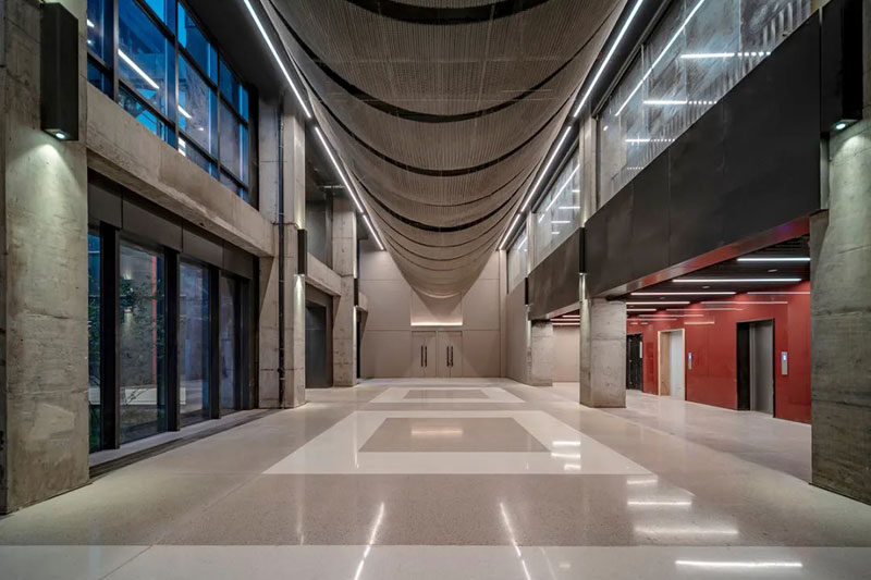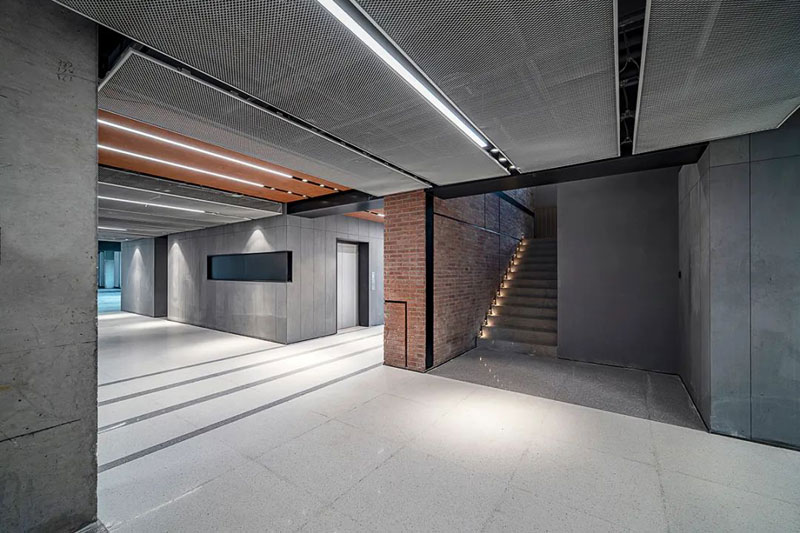 使用材料多以粗犷的质感呈现,水泥漆、灰泥、锈钢板、金属网、水泥板,还有裸露的混凝土,表现出工业建筑豪放的质感。奔放、浓重、豁达,形成室内公共空间的性格。