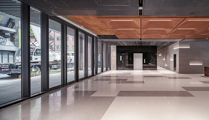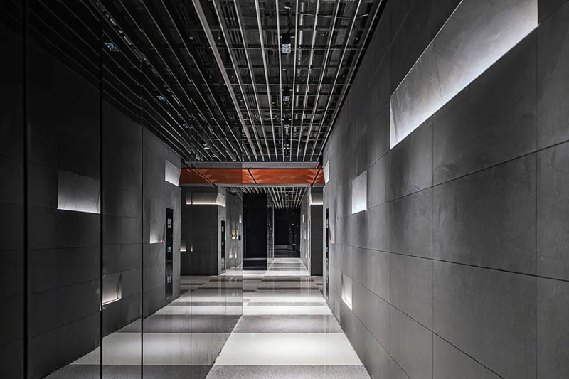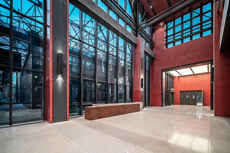 低饱和度红色钢板与黑色钢板形成视觉碰撞,锈板前台、悬浮灯饰与金属结构架让空间阔达简练,通高的玻璃幕墙借景旧建筑的残影,使之成为室内装饰的一部分。