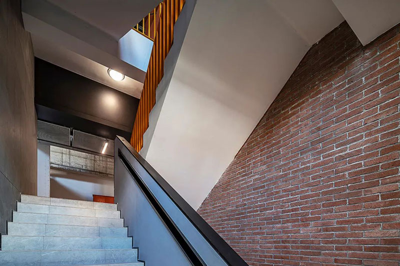 室内空间造型多以棱角分明的几何形体为主,减少装饰类细部,铁锈褐、水泥灰、烟熏黑等暗冷色调元素交织在一起。局部通过红砖作为点缀,减少浅色系材质的使用,让自然光线将空间变得更有质感。