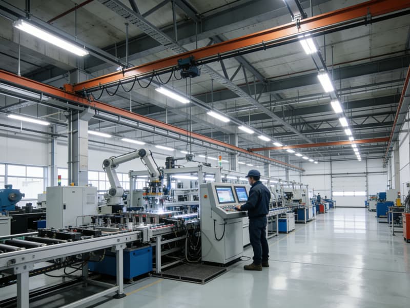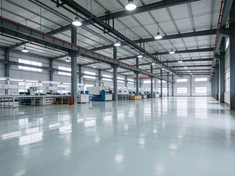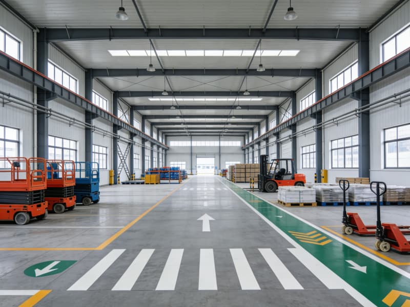 步入内部,生产区域空间开阔,顶部采用裸露的钢梁结构,搭配轨道式的照明灯具,保证充足且均匀的光线,满足高强度的生产作业需求。地面铺设耐磨的环氧树脂地坪,不仅耐用,还易于清洁和维护。