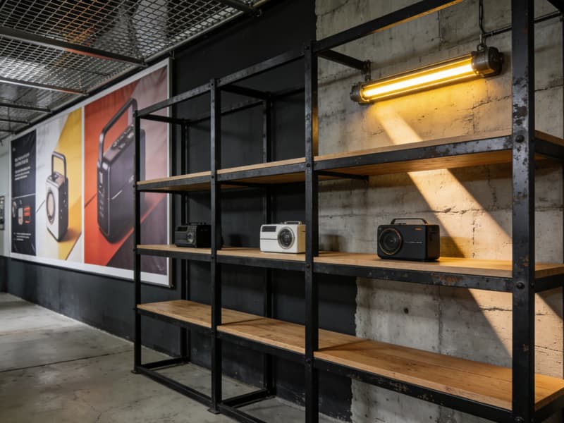 产品展示区则打破传统厂房的单调,采用木质与金属结合的展示架,背景墙以大幅的产品海报装饰,营造出专业且具吸引力的展示空间。