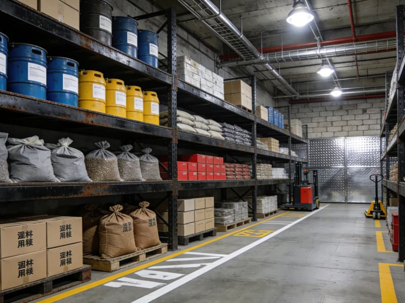 原料存储区设置多层式的金属货架,方便分类存放不同原料,提高空间利用率。区域间通过清晰的标识线进行划分,保障物流运输的顺畅。
