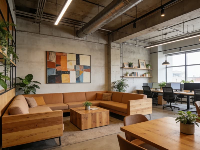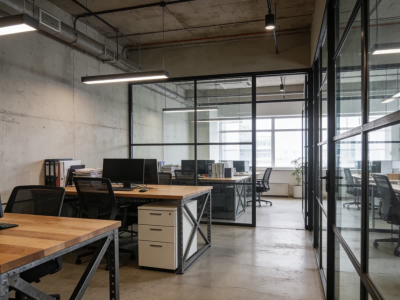 办公区延续工业风格,办公桌选用金属框架搭配木质桌面,文件柜简约实用。通过玻璃隔断划分不同的办公区域,既保证独立空间,又不影响整体通透感。