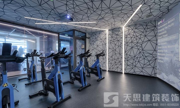 3、动感单车房设计 动感单车房的装修和操房差不多,在风格设计中也要求注意与整个健身房的风格融合统一,不要只追求酷炫感。动感单车是一个特殊项目,具有极强的煽动性,可以即刻提升会员或参观者的健身欲望,因此一般安排在整个健身房都能注意到的空间里。