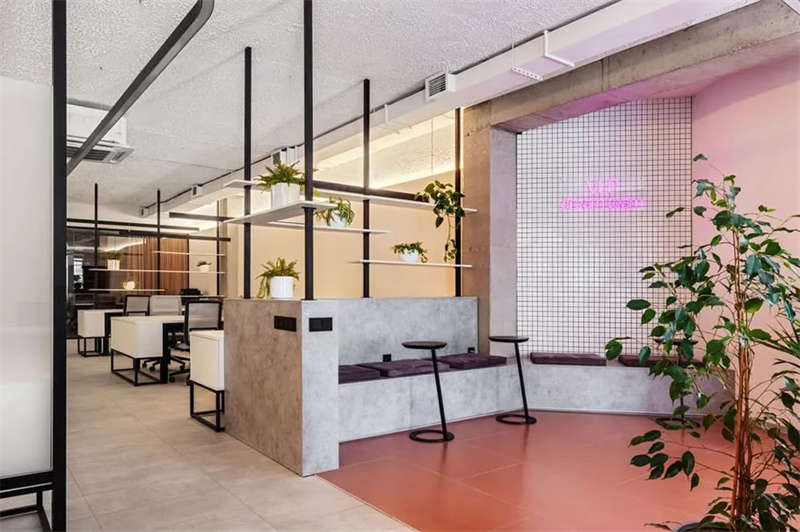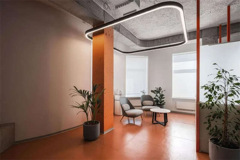 一种是沿办公室周边设置了一圈灯带,灯光从白色天花板上反射出来,散发出令人赏心悦目的温暖漫射光?;褂幸恢窒咝哉彰餍问胶粲α飨咝偷慕ㄖ掷?,将整个办公室从入口区域连接到行政工作区。另一个这样的设计元素出现在厨房区,当阴天自然光不足时可以照亮这里的空间。此外,每组工位都有一个独立光源,如有必要,每个员工都可以自行打开或关闭。