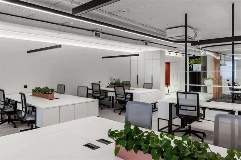 浅灰色的顶面与地面,配以白色墙体和主体办公家具,再辅以缜密的灯光照明,让室内呈现明亮纯净的光彩质感;黑色线性元素的加入丰富了空间构成和视觉趣味性;唯一的暖棕色彩的点缀让空间更灵动更富有层次感,也为纯净极简的空间带去一抹温暖气息。