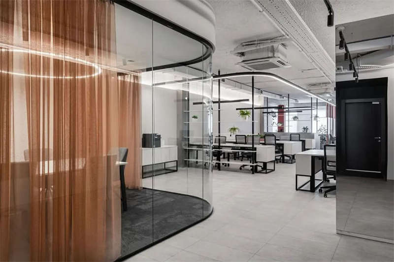 会议室的半圆形形状类似于智能手机上的耳机。由透明的玻璃围合的会议室即界定了空间,又带来轻盈灵动的通透感,且玻璃自身无与伦比的光泽感也赋予空间时尚和未来的气息。
