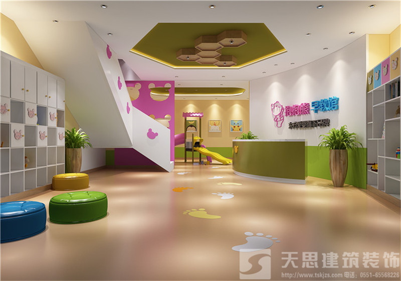 随着现如今家长对于子女教育的逐步重视,围绕幼儿的早教亲子中心也越来越多。面临激烈的市场竞争,良好的环境体验是吸引家长关注品牌的窗口。因此幼儿早教中心在进行装修设计的过程当中,就应当注意融入品牌与功能的概念。该设计由天思装饰公司旗下栗工全组成员合作共同完成。于5月正式开工。