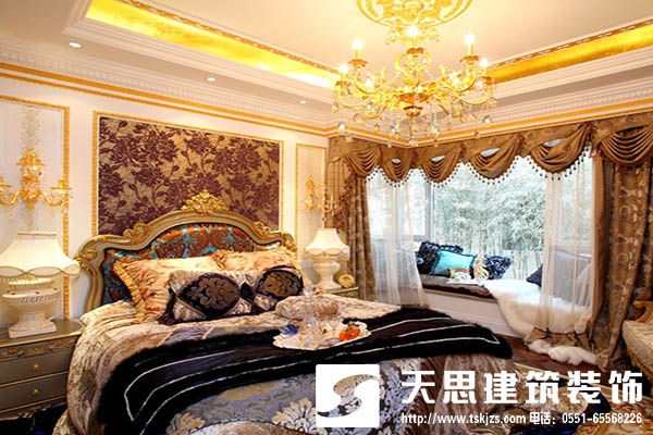 这个和上图有明显的区别,这是一个欧式装修风格的卧室。吊顶采用极为欧式还有布艺窗帘。灯槽也是采用了金色作为背景色。使整个空间看起来极为金碧辉煌,更中式的比较欧式显得比较富丽堂皇极为惹眼。但是中式讲究的低调内涵,大气和沉稳。这只是灯饰在两种中袖风格中不同的作用。其实现实中装修风格多样化,配合装修材料和软装的搭配选择合适的灯饰,能够给你带来更多的惊奇。