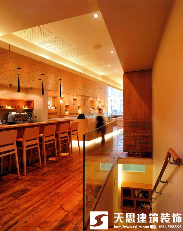 店铺后部特别定制的玻璃吊灯象征着可可豆的豆荚。其他的设计元素包括回收的松木地板、石灰石柜台和台面、鲜橙色皮革、橡木制品以及长条喷漆天花板。北京餐厅设计师在处理天花板时,将不同的元素统一在一起,突出了空间的长度并将人们的眼球吸引到店铺后部。地下室主要是用来展示的厨房,里面设置着巧克力制作课程和工坊。
