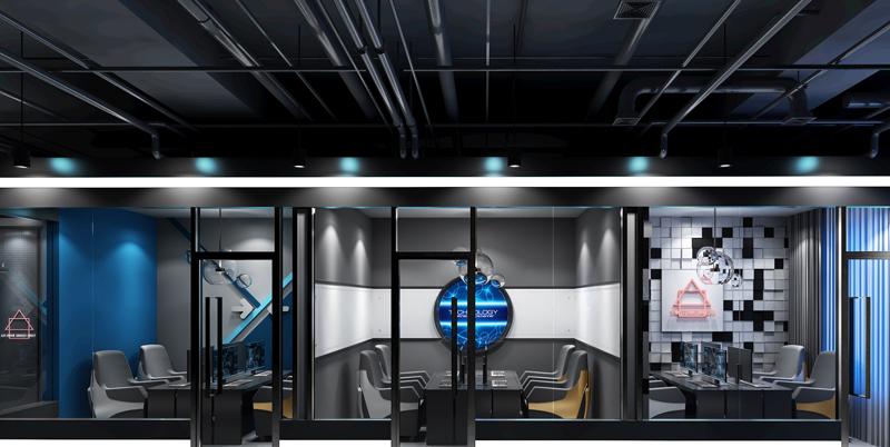每一处都充斥着电竞感,神秘酷黑的走廊设计中点缀白色灯光线条,令人心动又热血彭拜。所谓工欲善其事必先利其器,想要在网咖电竞大潮中占据先机,第一步先搞好电竞氛围。