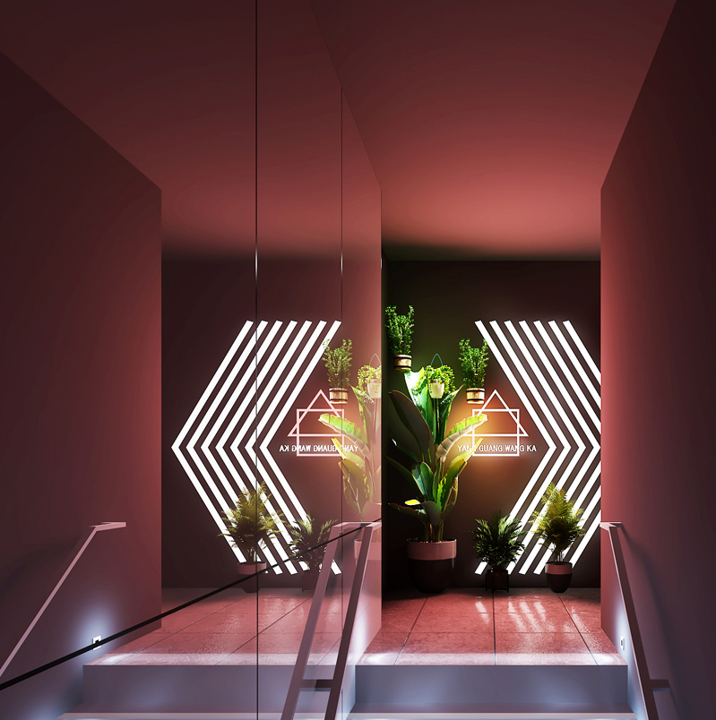 电竞氛围的营造不是单一的,而是无处不在。楼梯入口处醒目而又充满趣味的灯带指示标,巧妙的标识着空间的转角,入门处便有一种电竞感。