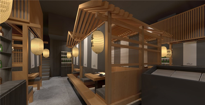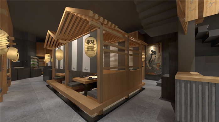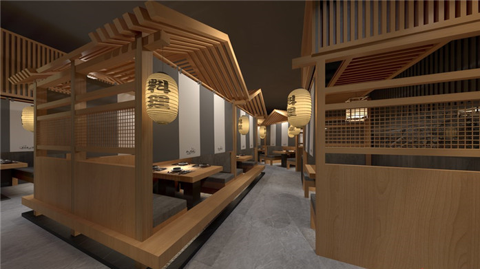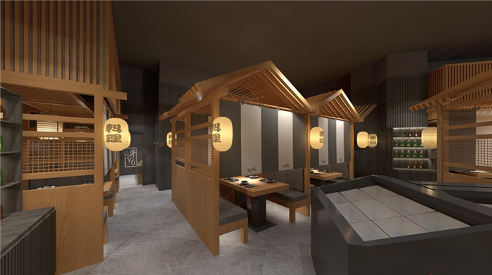 整体设计风格上以日式精致私密性为主,每个餐台都有独立的隔断进行分割,这样在整个空间中就会形成错落有致的空间布局,不仅美观而且空间利用率高,同时保障了顾客就餐的私密性。