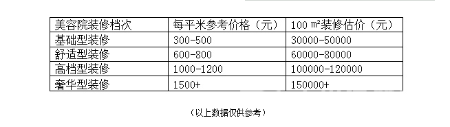 以上是我们根据当前的市场行情,所制定的一份参考装修价格表,当然在实际当中,根据地理位置以及材料选择,还有装修风格等各种因素,都会对美容院的装修价格起到影响,所以美容院装修要花多少钱还得以实际情况为准。