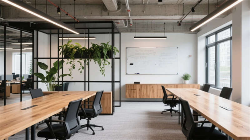设计从本土气质中汲取灵感:图书角的阶梯书屋如皖北梯田般层叠上升,生态休闲区的苔藓墙面呼应淮北平原的绿意,竹木色调贯穿始终,在工业框架中注入自然呼吸感。创意沙龙区采用可重组家具,鼓励思维碰撞;而半透明的会议室隔断则隐喻开放沟通的企业精神。