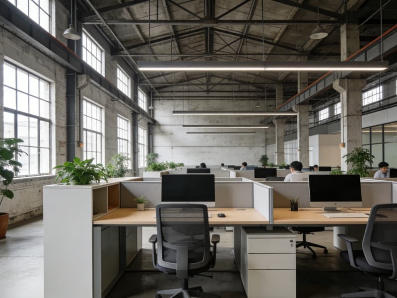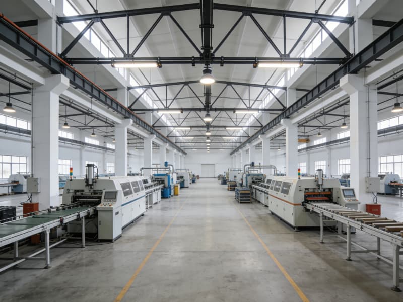 走进厂房内部,生产区域空间开阔,挑高的设计为大型生产设备提供了充足的安置空间。顶部采用裸露的钢结构桁架,搭配轨道式照明灯具,既满足了生产作业对照明的需求,又强化了工业氛围。地面铺设耐磨的水泥自流平,坚固耐用且便于清洁,符合工业生产的实际要求。生产设备按照工艺流程有序排列,各区域之间设置了宽敞的运输通道,确保物流运输的顺畅高效。
