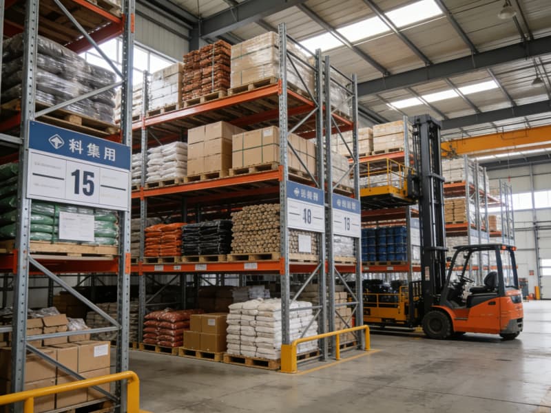 原料存储区运用多层式的金属货架,将空间进行了充分的垂直利用,不同类型的原料分区存放,标识清晰,便于管理和取用。同时,配备了先进的搬运设备,提高了货物的搬运效率。