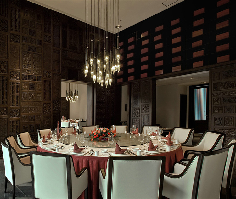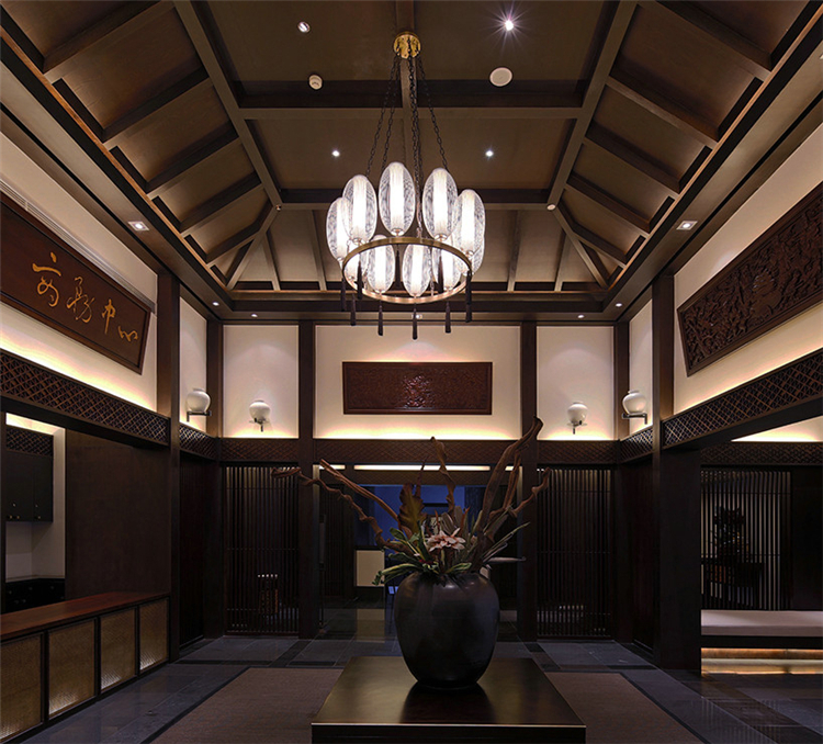 走入大堂,室内空间宽阔,天花鳞次栉比通向楼梯方向,墙面灰色石材雕刻,将桃花源记中的诗句映入客人眼帘,禅境古意扑面而来。镂空屏风隔墙的设计,让空间隔而不断,与具有传统韵味的家具和配饰相互交融,打断俗世的纷扰。柱子和天花上的装饰灯具,利用金属和木材两种截然不同的材料和质地,创造空间内在张力,透过锐利的金属、细腻的木质线条强调空间结构,精致笔挺的吊灯,令空间由内向外展现独特魅力。