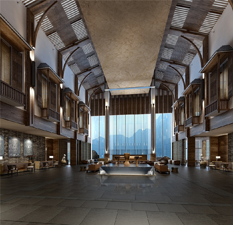 本案度假酒店的室内设计灵感来自于瑶族民居的生活态度,并结合对大自然的尊重,运用天然素材以当代风格重新演绎传统设计。山水表现“瑶美”,鼓火表现"瑶情”,图腾犬则表现“瑶魂”。以盛大的篙火晚会为蓝本。融入舞台和展示空间的概念。以此增加戏剧化效果。提升宾客对空间的精神感知。