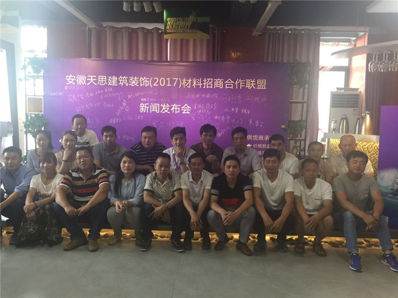 2017年6月4日,安徽天思建筑装饰(2017)材料招商合作联盟新闻发布会在合肥公司召开,来自合肥的三十余家知名材料商代表与天思装饰公司领导齐聚一堂,共叙商情。在天思这个平台上