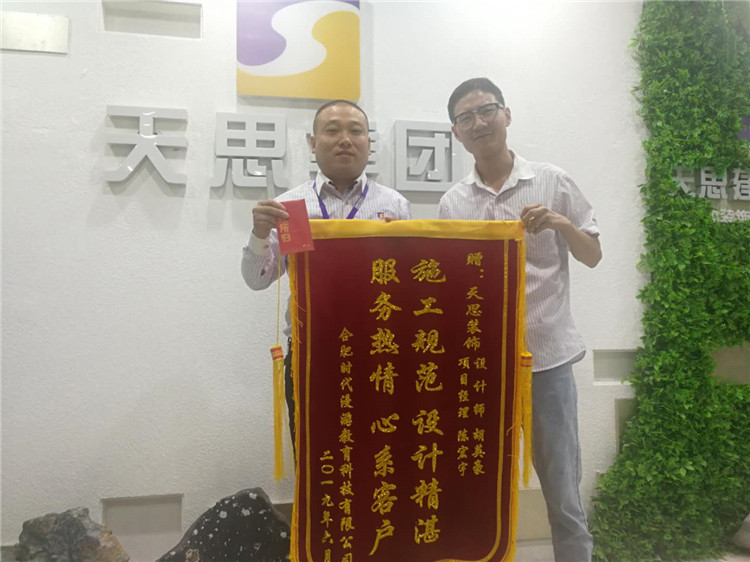 业主在百忙之中特意来天思装饰赠送锦旗,对施工项目经理陈工的施工质量和服务赞不绝口.业主道:他怀着万分感激之情,向陈工、胡工及天思装饰全体员工表示真诚的感谢和良好的祝愿
