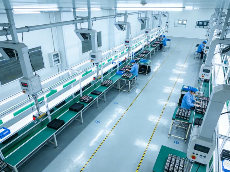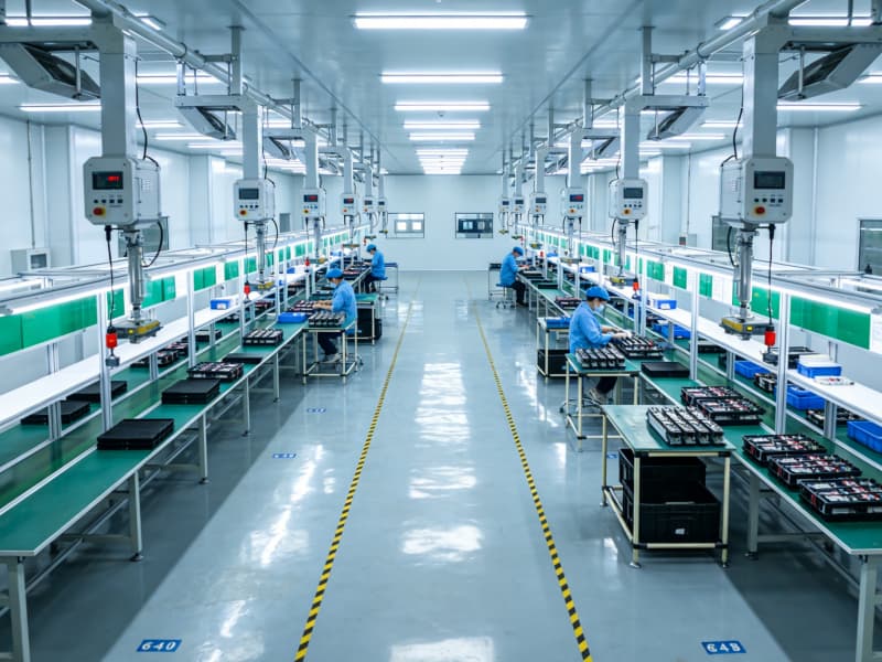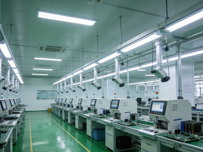 进入内部,生产区布局紧凑且合理,采用智能化的悬挂式生产设备,搭配可调节的无影灯光源,确保生产操作的精准度。地面使用防静电地坪,满足电子设备生产需求。