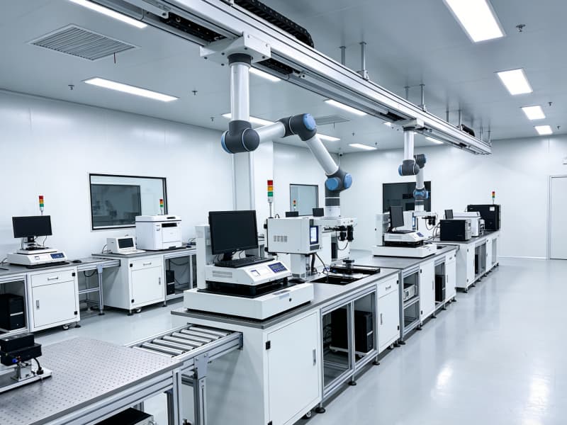 产品测试区以白色为主色调,营造简洁纯净的环境。各类先进的测试仪器有序摆放,顶部的轨道式机械臂可辅助完成复杂测试流程。