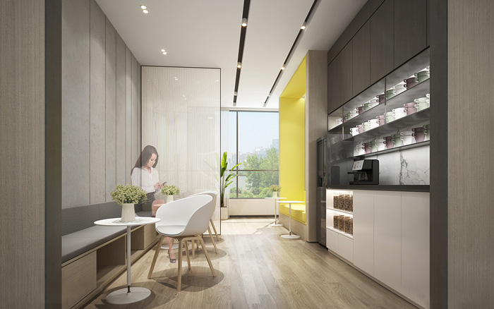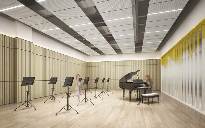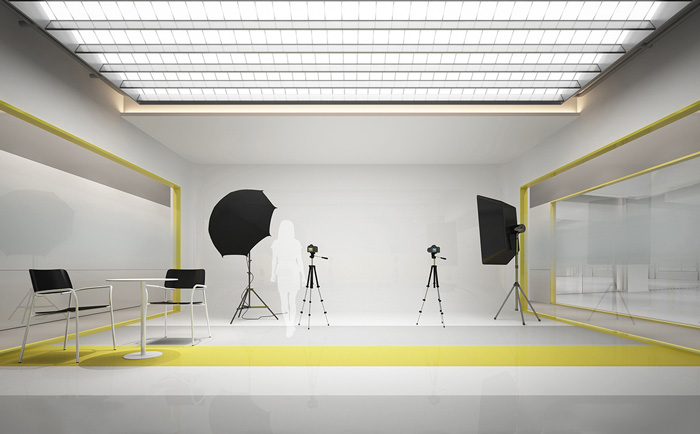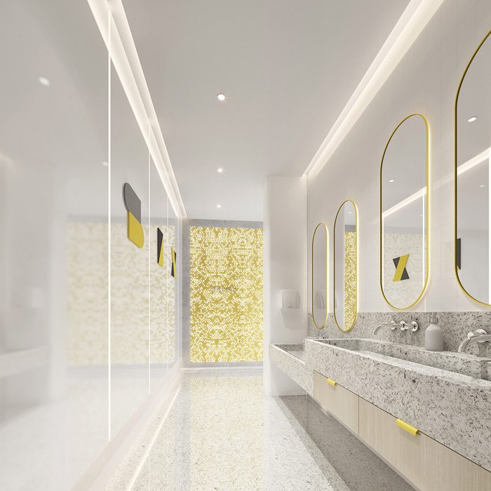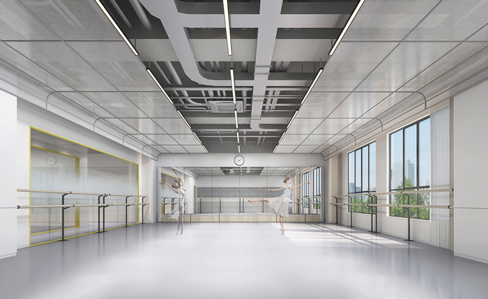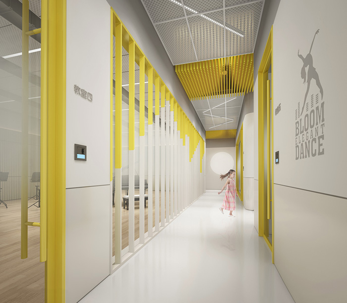 此处艺术学校设计中,告别了五彩斑斓的颜色,突出了空间的简洁与干净,用黄色做为点缀色提升空间的趣味性。