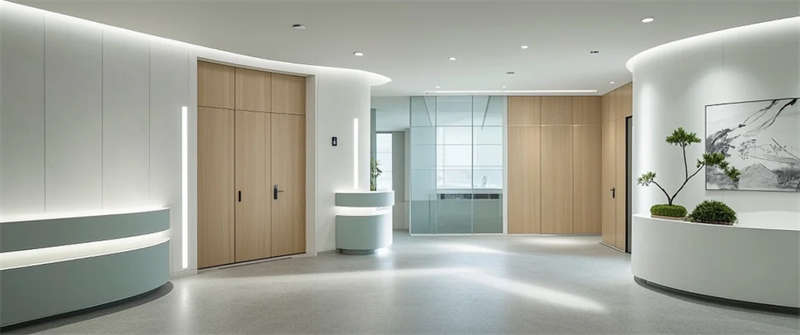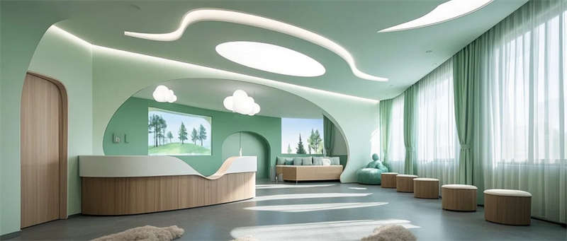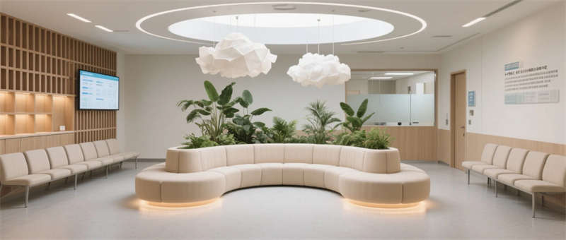 这个医疗空间以自然疗愈为语言重塑传统医院体验。建筑内部流动的浅木与灰绿色系,搭配原生绿植景观墙,模糊了室内外边界,让自然光与绿意成为治愈媒介。门诊走廊的弧形墙面消解机构冰冷感,儿童诊区的森林投影与云朵软包,用叙事化设计缓解诊疗焦虑。