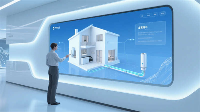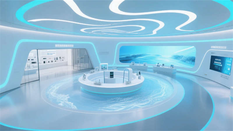 展厅以环形动线串联六大核心模块:入口10米宽LED水幕墙动态演绎净水原理;中央悬浮式产品矩阵展台,通过全息投影拆解RO膜过滤技术;实景化场景区1:1复刻家庭厨房、商务办公楼及工业厂房,搭配交互式水质监测实验台;独创的“虚拟管家”AR系统,可生成个性化净水方案并投射至合肥典型户型模型??占涠ゲ坎捎貌问杓频牟ɡ诵蔚仆?,象征长江与淮河水系交汇,地面嵌入城市节水数据可视化地砖,凸显本土环保责任感。