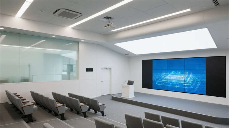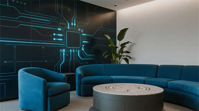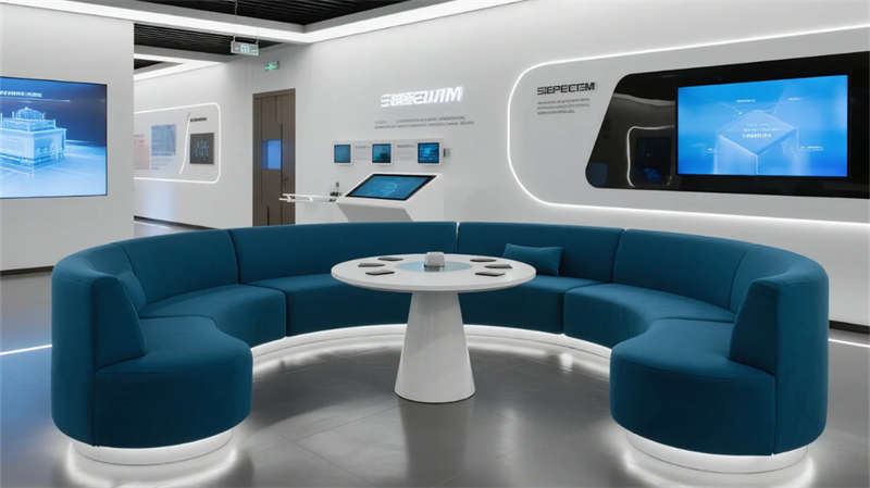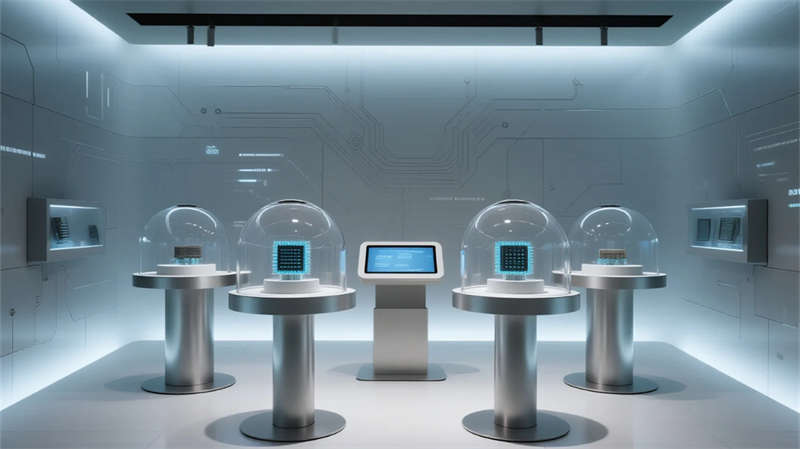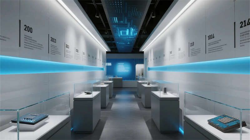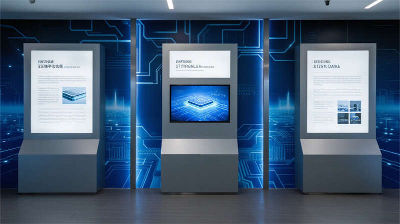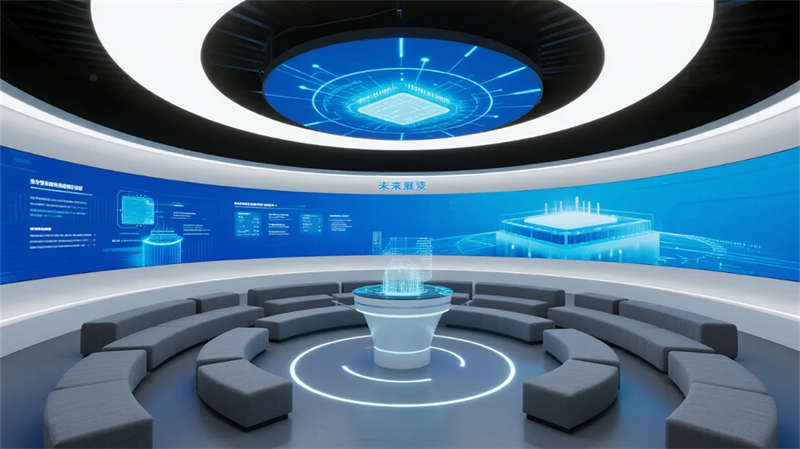该半导体企业展厅以现代简约风格为核心,通过流畅空间布局与高科技元素,打造沉浸式科技体验。设计突出半导体技术的抽象表达,利用蓝色与灰色调营造冷静、专业的氛围,同时融入玻璃、金属材质增强通透感。入口区以悬浮雕塑引导视线,产品展示区通过简约玻璃柜和触屏互动,生动呈现技术精髓;技术创新墙以动态图文展现工艺演进,历史廊道则以线性叙事唤起行业记忆?;ザ臀蠢凑雇康鞑斡胄裕捎没沸纹聊挥肴⑼队?,让访客直观感受创新应用。休息区与演讲区注重人性化,简约家具结合微光纹理,提供舒适交流空间。整体设计摒弃繁复装饰,以干净线条和光影变化强化空间流动性,不仅传递半导体领域的精密与前瞻性,更通过美学融合提升教育性和观赏性。展厅作为科技展示平台,旨在激发探索兴趣,体现企业对创新文化的重视。