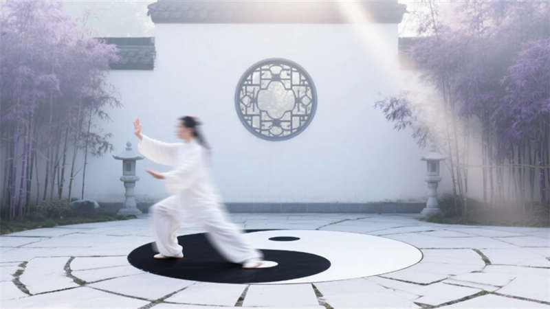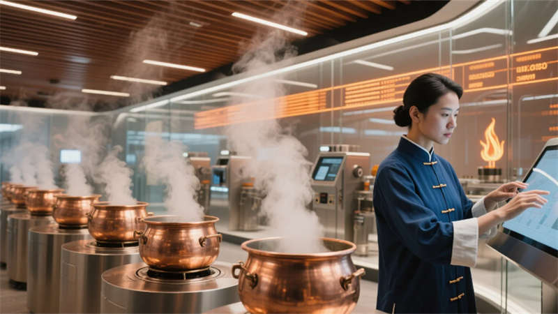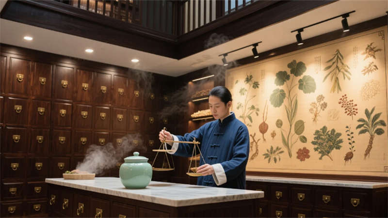 露天庭院白石铺就太极纹路,素衣身影在紫竹雾霭间起势推掌,漏窗剪出晨练动态。名医诊室红木案上脉枕微温,博古架药材标本与满墙医典沉淀千年智慧。智慧煎药中心的铜锅阵列于胡桃木顶下吞吐蒸汽,光影交织传统与现代。