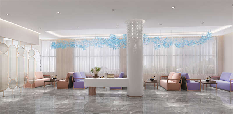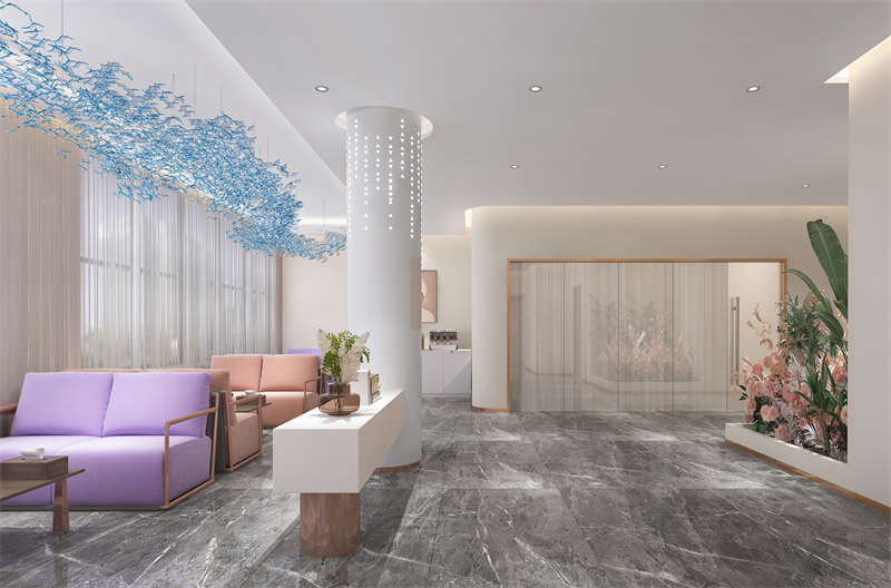 大厅,极致简单的配色,与富有质感的材质碰撞,顶吊灯颜值高、光线柔,烘托出医美大厅的柔和氛围。